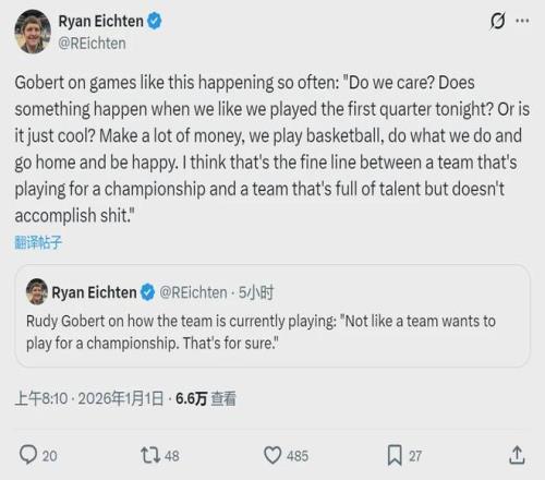 北京时间1月1日,森林狼102-126不敌老鹰。戈贝尔首发出战28分27秒,投篮6中3,罚球0中0,得到6分11篮板3助攻1抢断,正负值-22全场第二低。赛后戈贝尔怒批全队:“我们真的在乎胜利吗?还是挣了大把钱,就随便打打?”