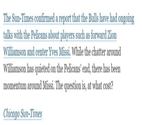 想要促成交易,鹈鹕队必须抱着摆烂的心态,将锡安与米西打包,换取公牛队一批合同即将到期的球员,例如中锋尼古拉-武切维奇、后卫科比-怀特以及前锋杰伦-史密斯。