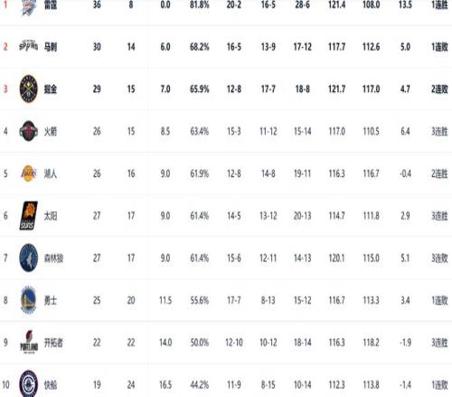 从目前西部的排名来看,雷霆仍然是以36胜8负,排名西部第一,他们领先第二名的马刺6个胜场。西部前三的争夺相比起第三到第七位不是特别激烈,掘金和火箭分列二、三位。