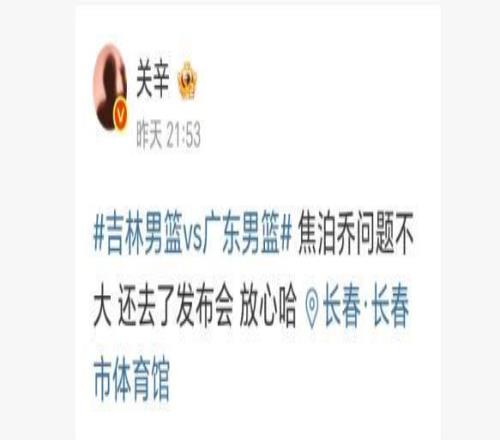 下一轮非常关键,对手将是上赛季的黑马山西队。那么问题来了,受伤的焦泊乔能否出下一轮与山西队的比赛吗?赛后关辛透露了焦泊乔的情况,他表示“焦泊乔问题不大,还去了发布会,放心哈。”下一轮与山西队的比赛在24日进行,广东队有三天的休息时间,经过三天的休整,应该说焦泊乔出战与山西队的比赛问题不大。
